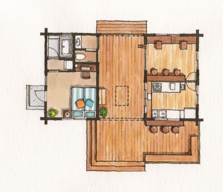 例えば、午後の日の光が差し込むポーチでロッキングチェアに揺られながら好きな本を読んだり、家庭菜園で収穫した野菜をガーデンキッチンで洗ってそのままかぶりついたり、ログ小屋(piccolo/ピッコロ)の中で好きなDIYに興じたり...ピアッツァはログのぬくもり・あじわいを楽しめるだけでなく、四季を全身で感じながら、田園生活を満喫できる、そんな仕掛けがいっぱいのログハウスです。